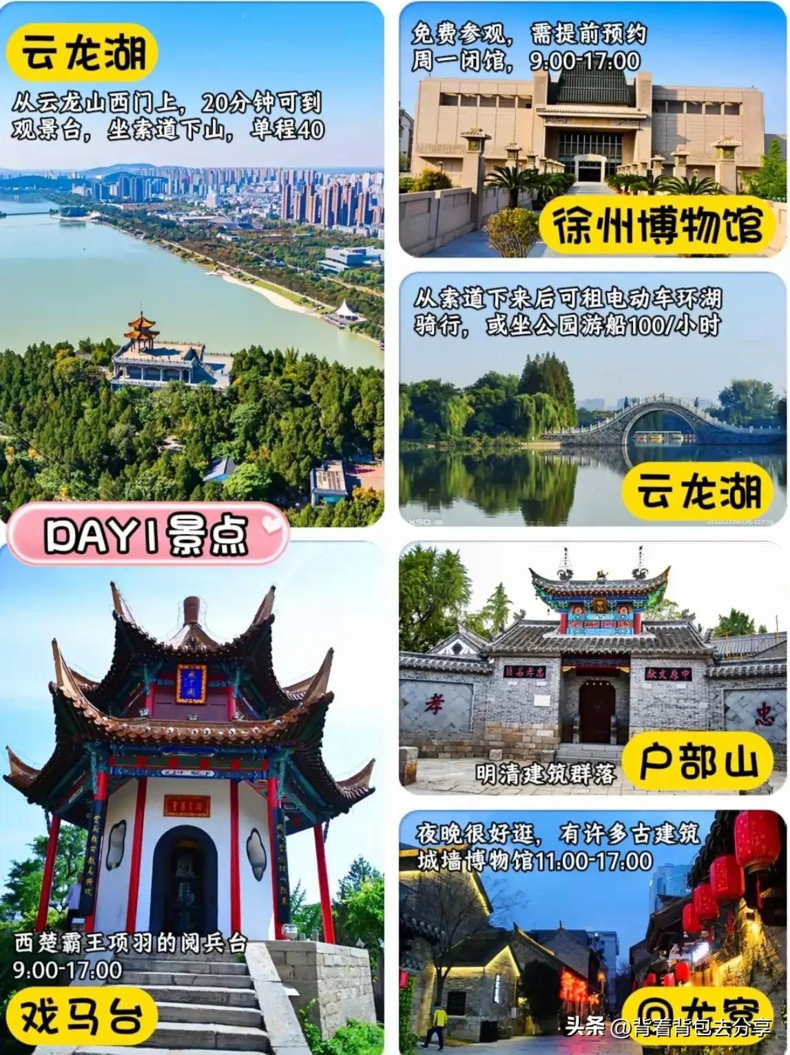 回龍窩歷史文化街區→戶部山戲馬臺→徐州博物館→雲龍山北門登山→雲龍湖,晚觀彭城風華實景演出,如若不觀演出,可反向遊玩