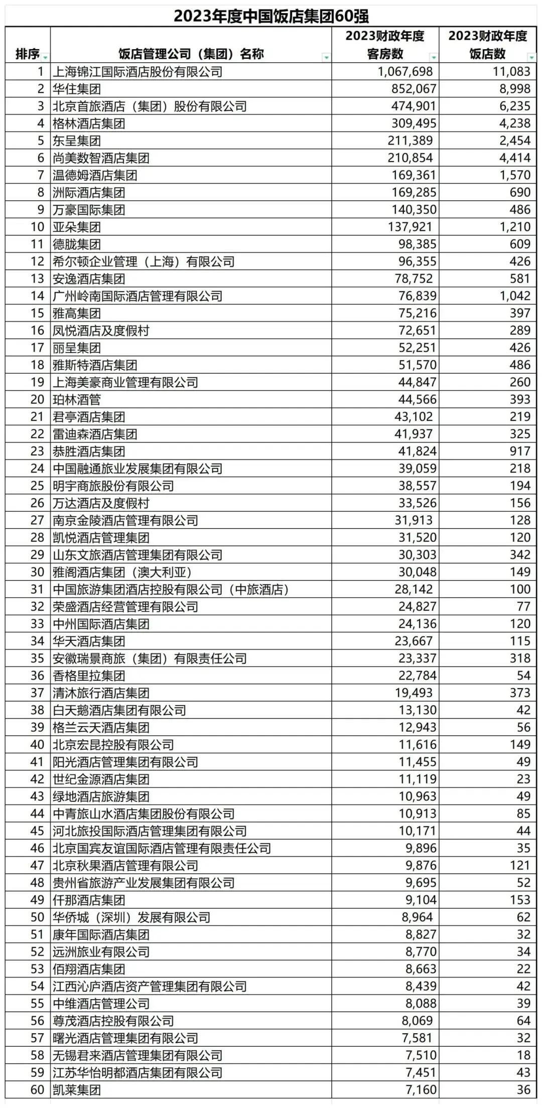 2023年度中國飯店集團60強公佈!