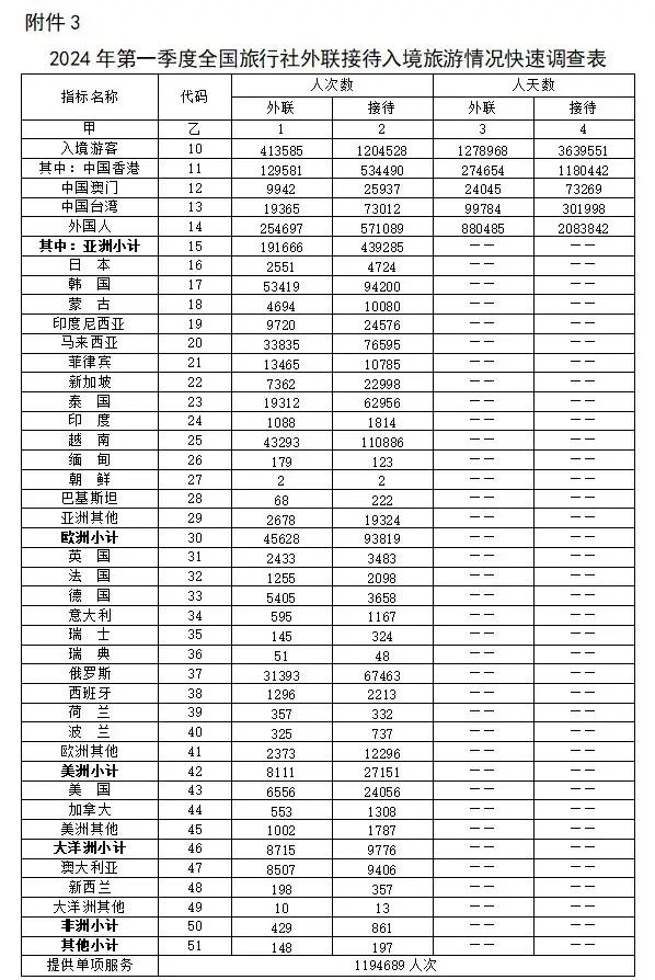 2024年第一季度全國旅行社入境旅遊外聯41.36萬人次、127.90萬人天;接待120.45萬人次、363.96萬人天。入境旅遊單項服務119.47萬人次。(詳見附件3)