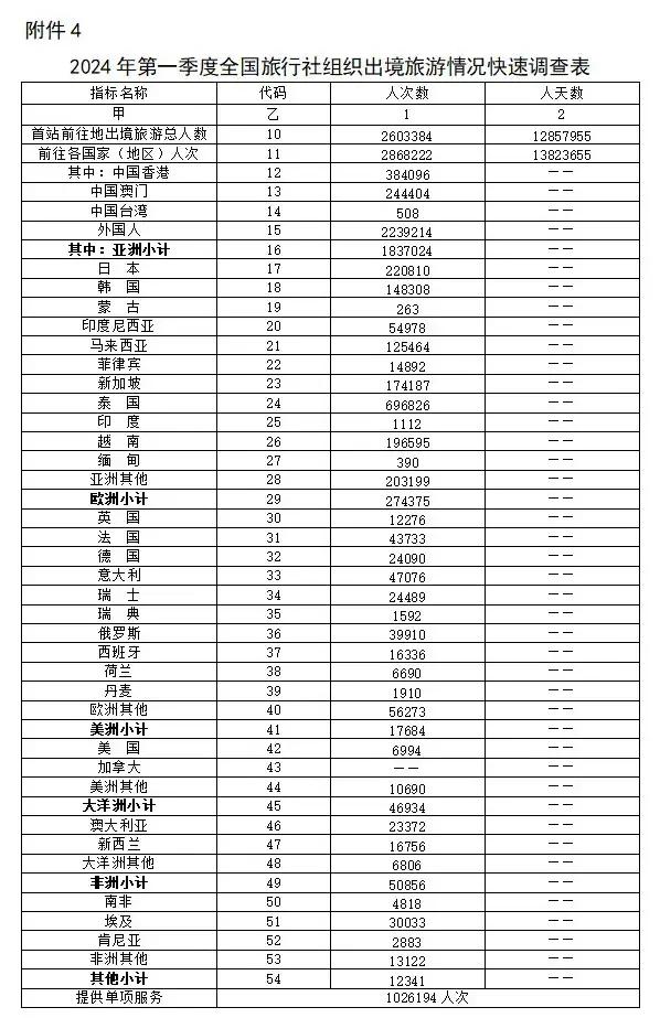 2024年第一季度全國旅行社出境旅遊組織286.82萬人次、1382.37萬人天。出境旅遊單項服務102.62萬人次。(詳見附件4)