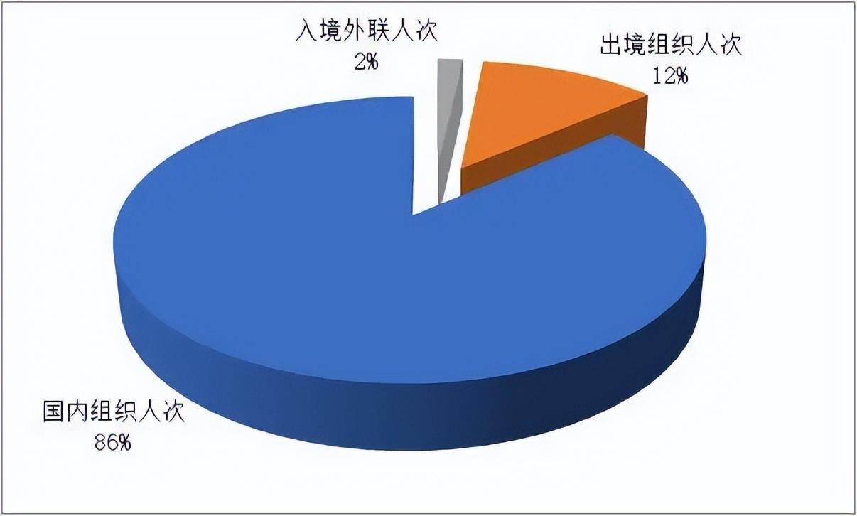 按照國內組織人次、入境外聯人次、出境組織人次三項指標,國內旅遊、入境旅遊、出境旅遊市場人次所佔份額依次爲86%、2%和12%。(見圖6)