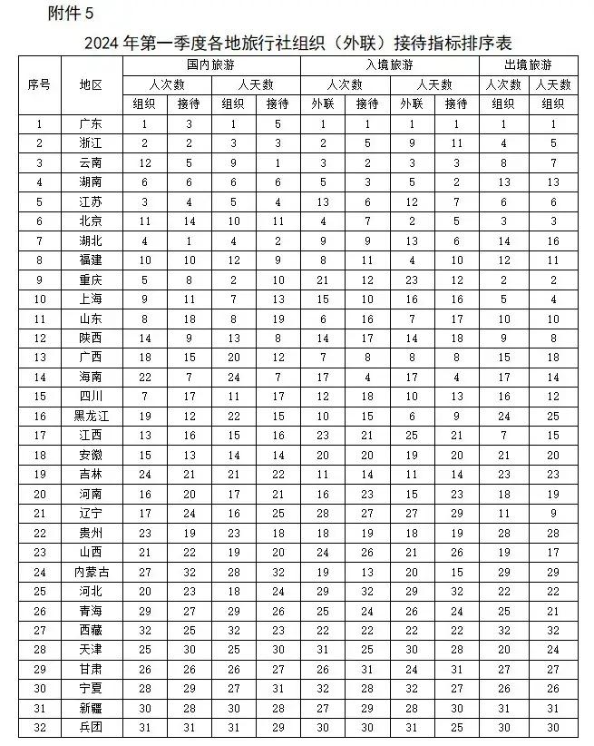 2024年第一季度旅行社三大市場組織(外聯)接待人次(人天)彙總排序前十位的地區由高到低依次爲廣東、浙江、雲南、湖南、江蘇、北京、湖北、福建、重慶、上海。(詳見附件5)