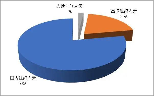 按照國內組織人天、入境外聯人天、出境組織人天三項指標,國內旅遊、入境旅遊、出境旅遊市場人天所佔份額依次爲78%、2%、20%。(見圖7)