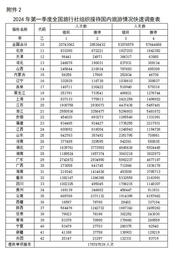 2024年第一季度全國旅行社國內旅遊組織2074.31萬人次、5307.66萬人天;接待2853.64萬人次、5764.47萬人天。國內旅遊單項服務1.76億人次。(詳見附件2)