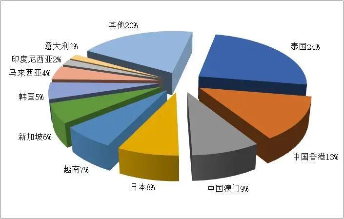 第一季度旅行社出境旅遊組織人次排名前十位的目的地國家或地區由高到低依次爲泰國、中國香港、中國澳門、日本、越南、新加坡、韓國、馬來西亞、印度尼西亞、意大利。(見圖5)