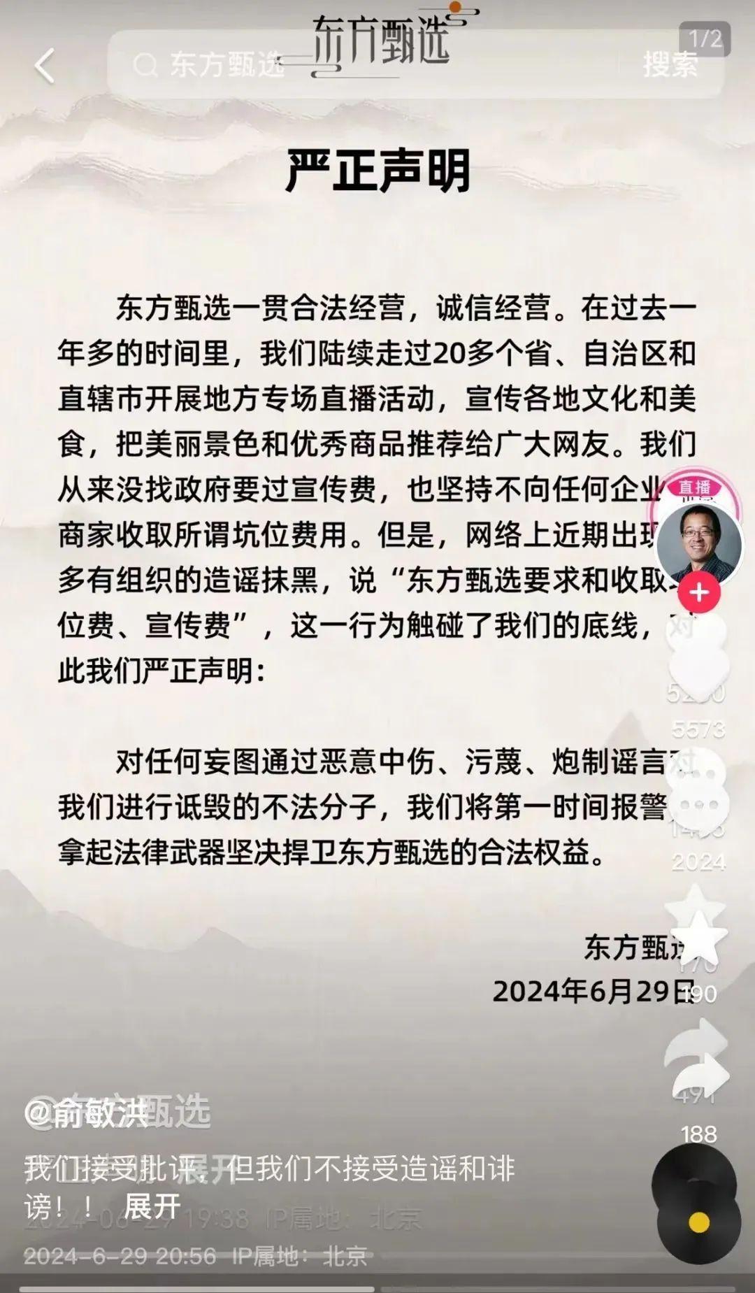 6月29日晚間,東方甄選發佈聲明表示,“東方甄選一貫合法經營,誠信經營。在過去一年多的時間裏,我們陸續走過20多個省、自治區和直轄市開展地方專場直播活動,宣傳各地文化和美食,把美麗景色和優秀商品推薦給廣大網友。我們從來沒找政府要過宣傳費,也堅持不向任何企業、商家收取所謂坑位費用。但是,網絡上近期出現許多有組織的造謠抹黑,說‘東方甄選要求和收取坑位費、宣傳費’,這一行爲觸碰了我們的底線,對此我們嚴正聲明:對任何妄圖通過惡意中傷、污衊、炮製謠言對我們進行詆譭的不法分子,我們將第一時間報警,拿起法律武器堅決捍衛東方甄選的合法權益。”