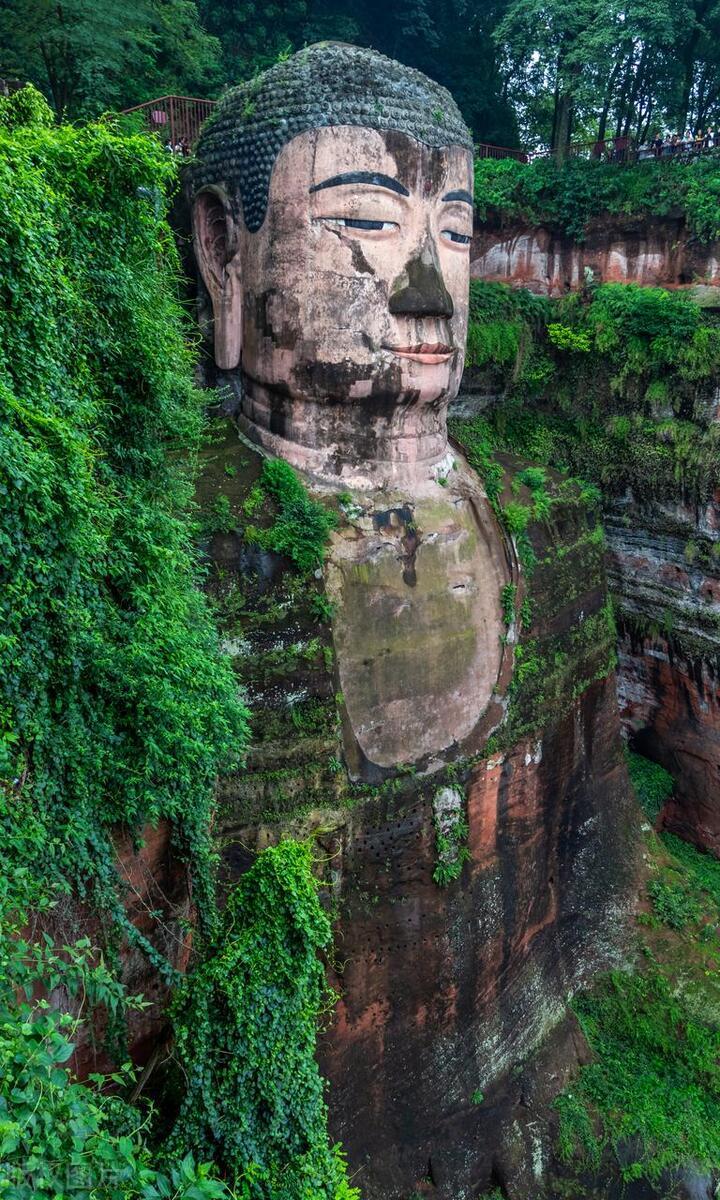 樂山大佛,通高71米,鑿建歷時90年,是世界上現存最大的石刻坐佛。數千年的風吹雨打仍不改其巍峨氣勢。