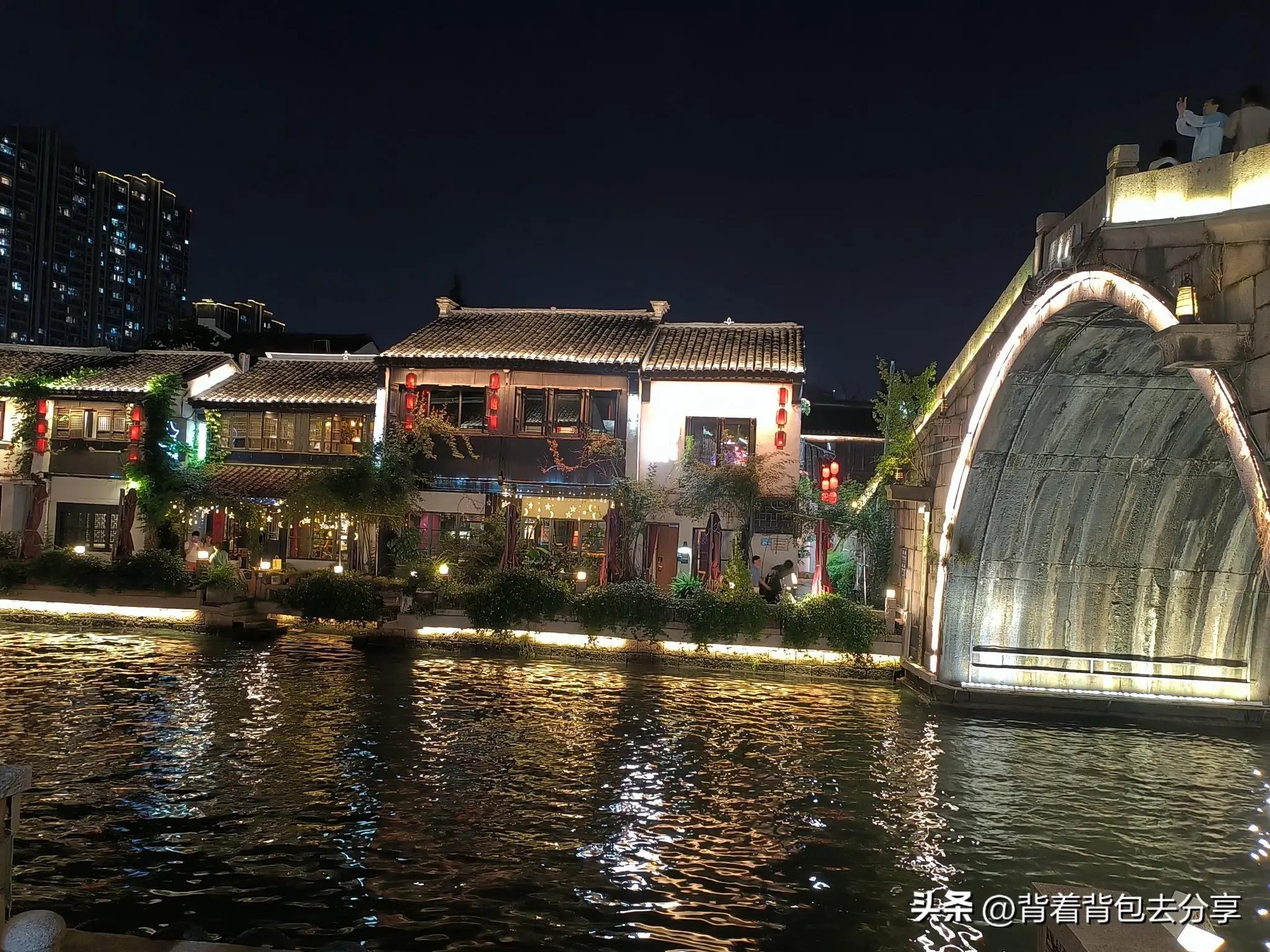 也可選擇遊船觀光,一直順着古運河,你可以看到經典的小橋流水,每天下午1點半到晚上9點半,建議夜遊觀光,晚上7點之後,乘坐古運河遊船,每半小時一班,行程約40分鐘,沿街的鋪子.酒吧和食肆五花八門,各顯神通的吸引着路人的目光和腳步,尤其是美食打卡,可以選擇乾堂吳韻等衆多的特色餐廳