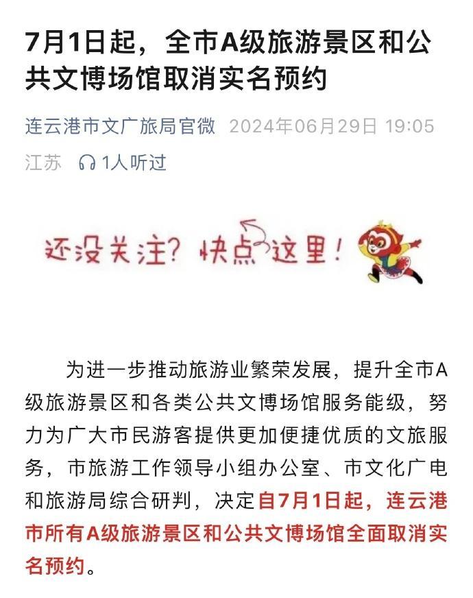 6月29日,連雲港市文廣旅局官微發文稱,爲進一步推動旅遊業繁榮發展,提升全市A級旅遊景區和各類公共文博場館服務能級,努力爲廣大市民遊客提供更加便捷優質的文旅服務,決定自7月1日起,連雲港市所有A級旅遊景區和公共文博場館全面取消實名預約。