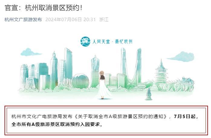 據杭州市文化廣電旅遊局消息,7月5日起,杭州全市所有A級旅遊景區取消預約入園要求。