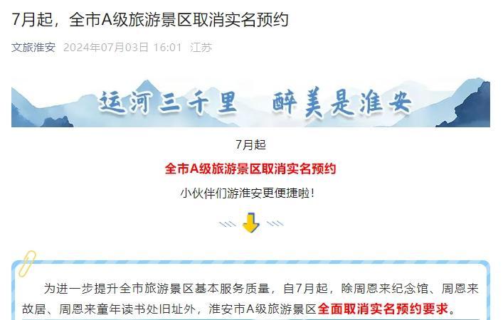 據淮安市文化廣電和旅遊局消息,自7月起,除周恩來紀念館、周恩來故居、周恩來童年讀書處舊址外,淮安市A級旅遊景區全面取消實名預約要求。