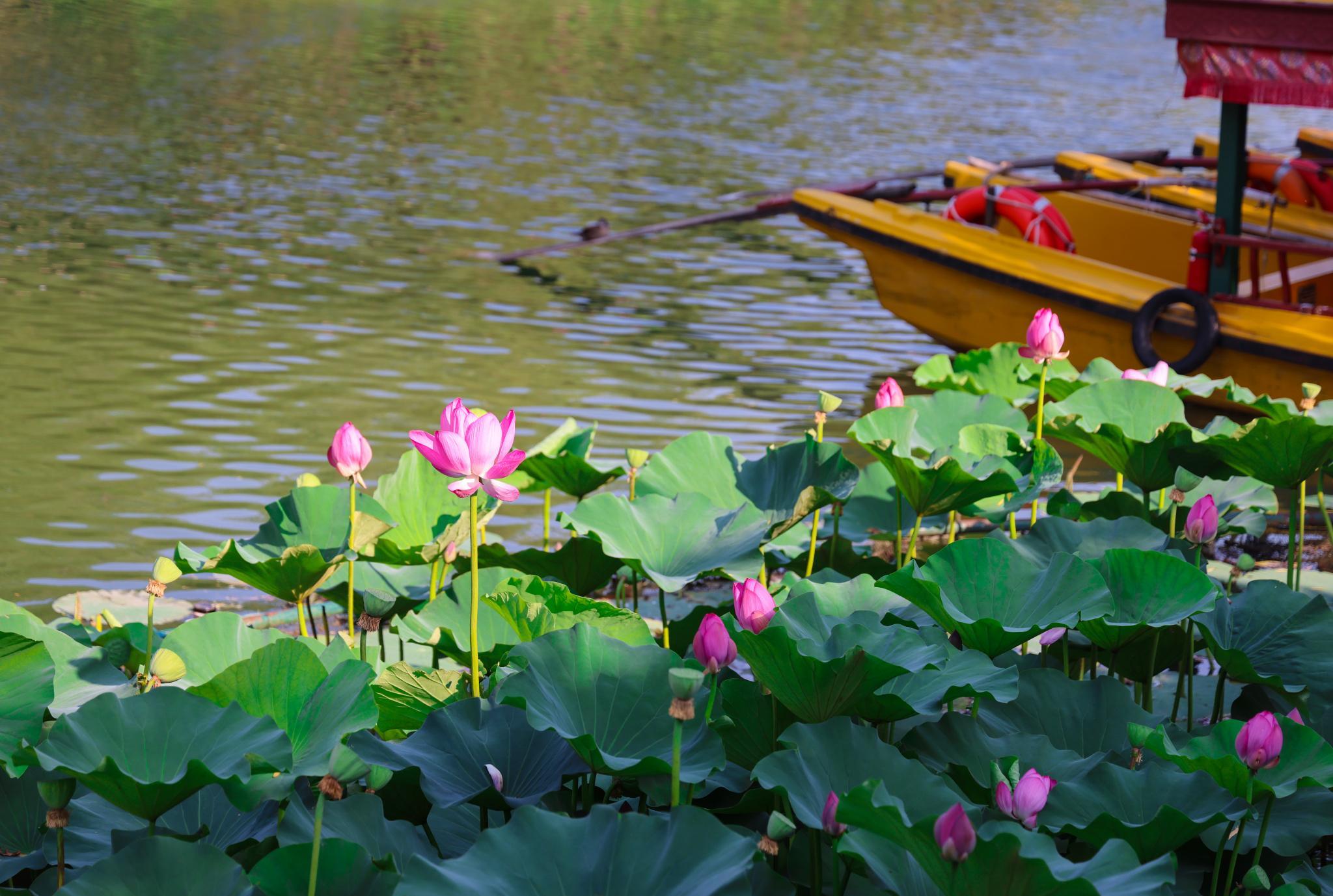 小暑正是荷花綻放的時節,清麗脫俗的荷花盛景爲夏日之旅帶來別樣的清涼。近日,北京國際雕塑公園荷塘內荷花漸次綻放,花朵靚麗飽滿,不少遊客在“盈盈一水間”感受“蓮葉何田田”的詩情畫意。