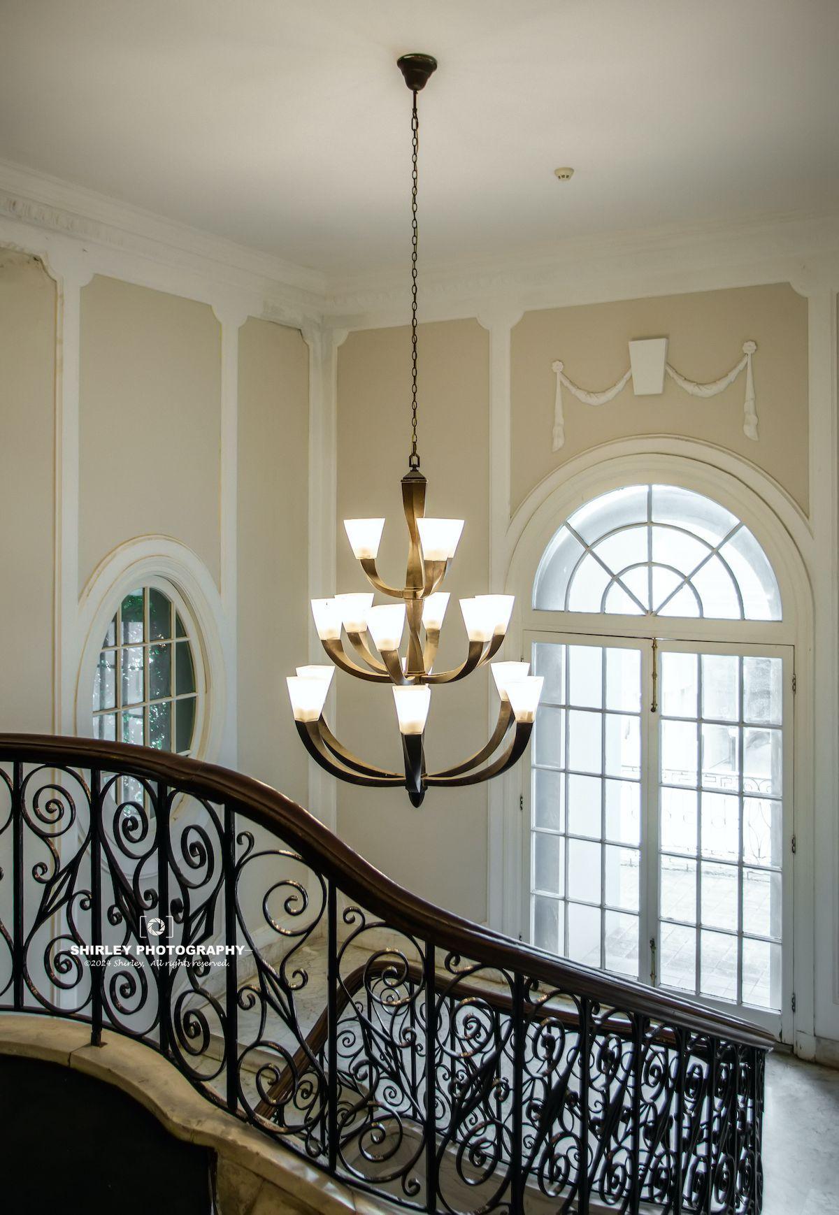 室內裝飾典雅精美。門廳爲黑白相間的大理石鋪地,淺色系的旋轉樓梯不見奢靡鋪張,倒有一絲意料之外的清新恬淡。獨特的橢圓窗戶外,是夏天特有的綠樹豔陽。