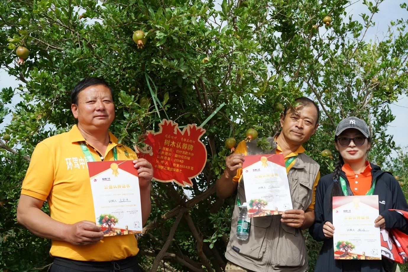 在伯什克然木鄉石榴園,環駕勇士們認種了10棵石榴樹,並鄭重地掛上了“怡寶環駕中國夢之旅愛心車隊”的認種牌。