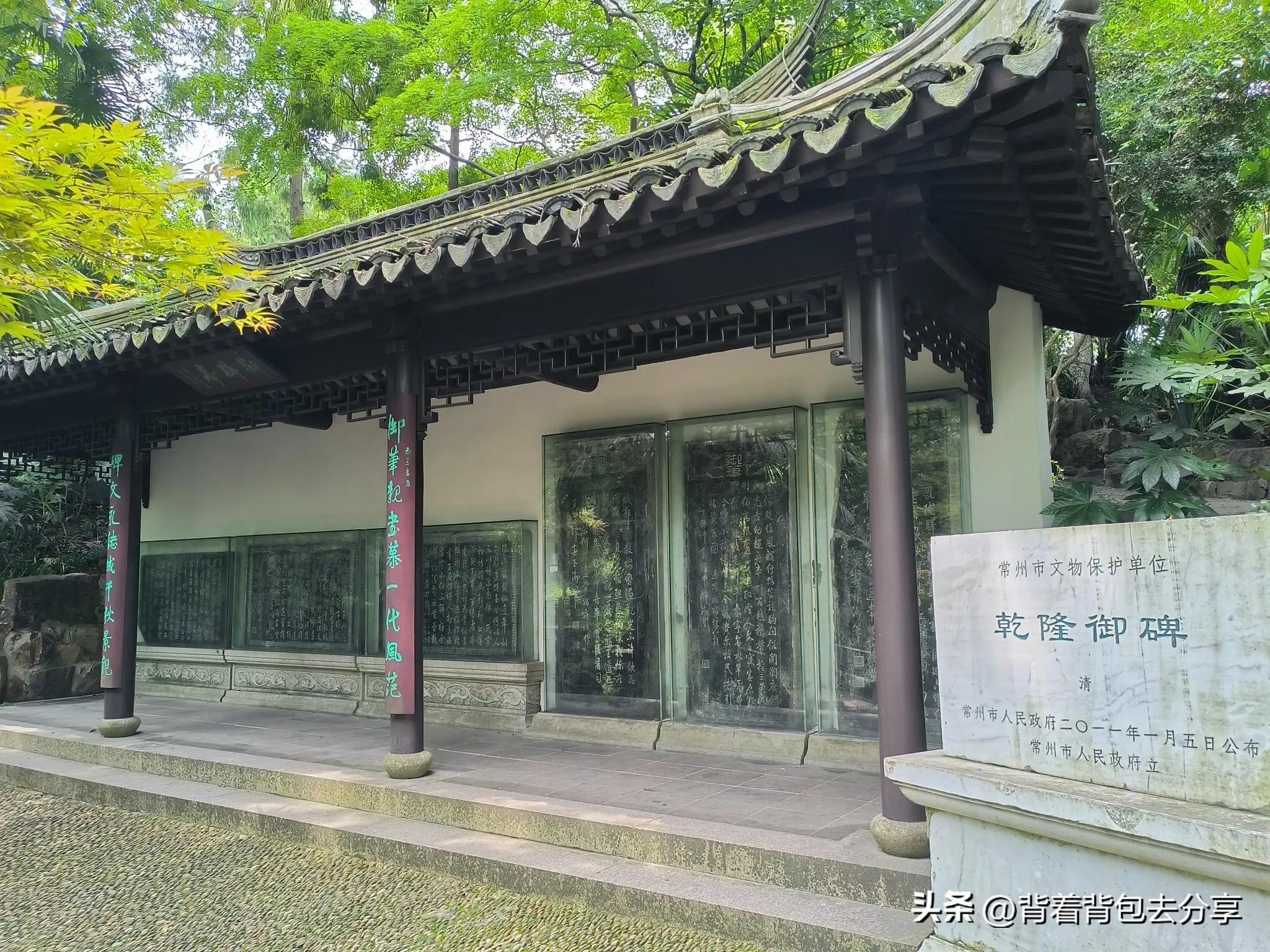御碑亭,亭內存有乾隆皇帝六次巡遊江南,四次來常時所寫六首詩的碑刻,書碑系乾隆帝即興詩作, 表達了乾隆皇帝對蘇軾的頌揚, 亦述及常州風俗民情,看過御碑亭,便來到了艤舟亭,這裏可是蘇東坡乘船來到常州停船上岸的地方,此亭建於公園的最高處,精美磚雕和木雕,有二龍戲珠與蒼松仙鶴等寓意的圖案,非常具有欣賞價值