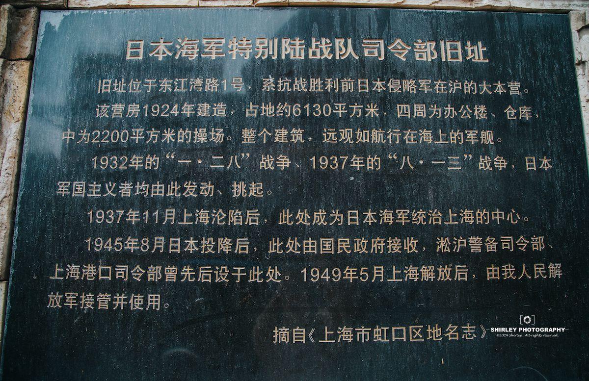 這棟建築建於建造於1924年,佔地 6130平方米,四周爲辦公樓、倉庫,中間是2200平方米的操場。建築內部可以屯兵2000多人和數十輛裝甲車,是日本帝國主義在上海的重要據點和指揮部。也是抗日戰爭勝利前日本侵略軍在上海的大本營。
