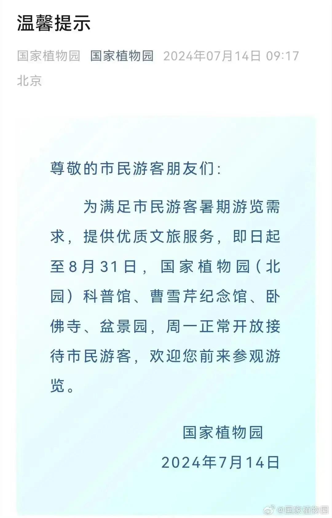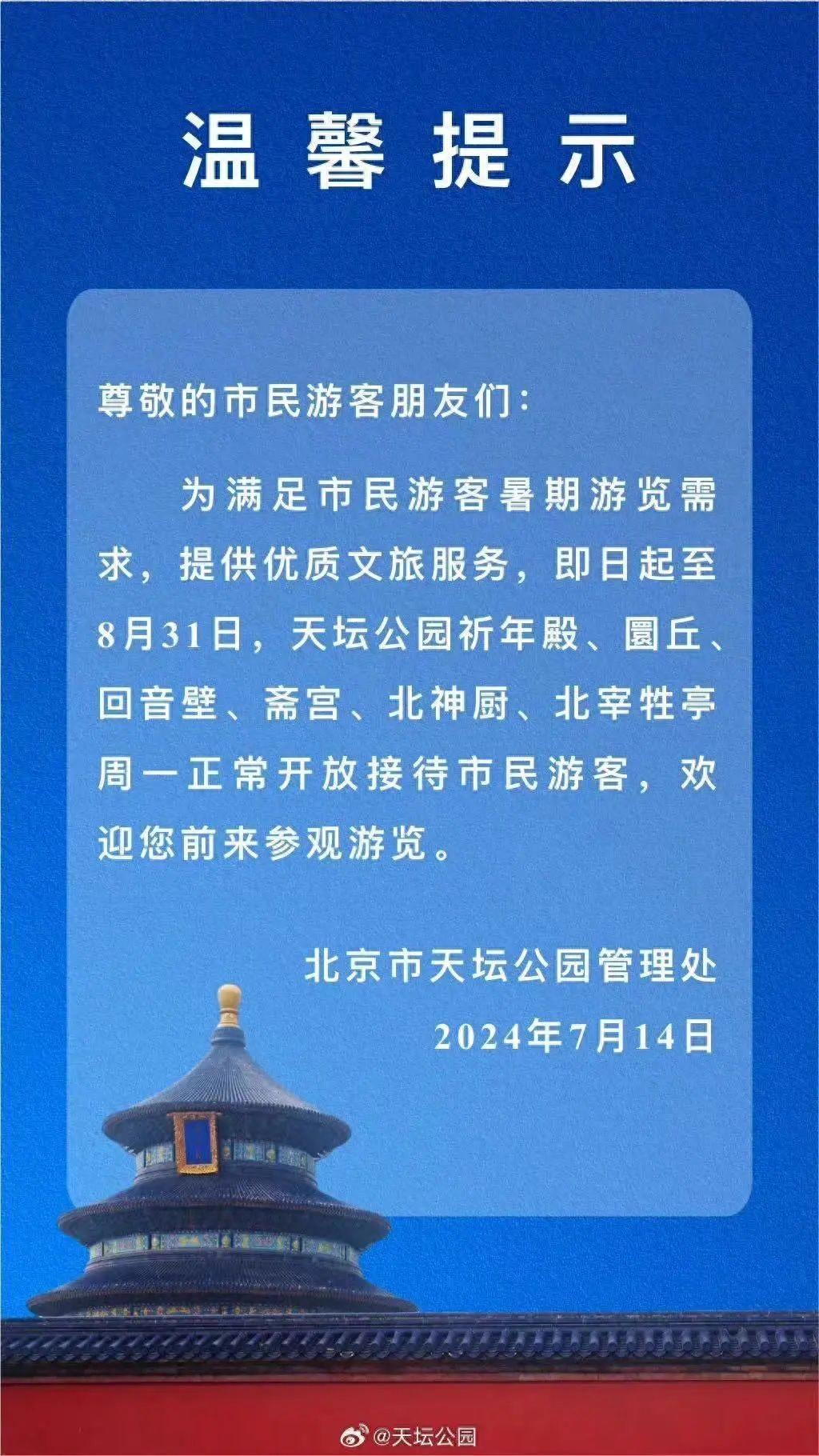 記者14日從北京市公園管理中心瞭解到,爲滿足旅遊需求,方便遊客安排出行計劃,自7月15日起至8月31日,北京各市屬公園和中國園林博物館取消週一文物古建院落、園中園、博物館閉園(館)的規定,全面開放接待市民遊客,包括:頤和園佛香閣、天壇公園祈年殿、北海公園瓊島、景山公園壽皇殿和中國園林博物館等園內的各類場館。