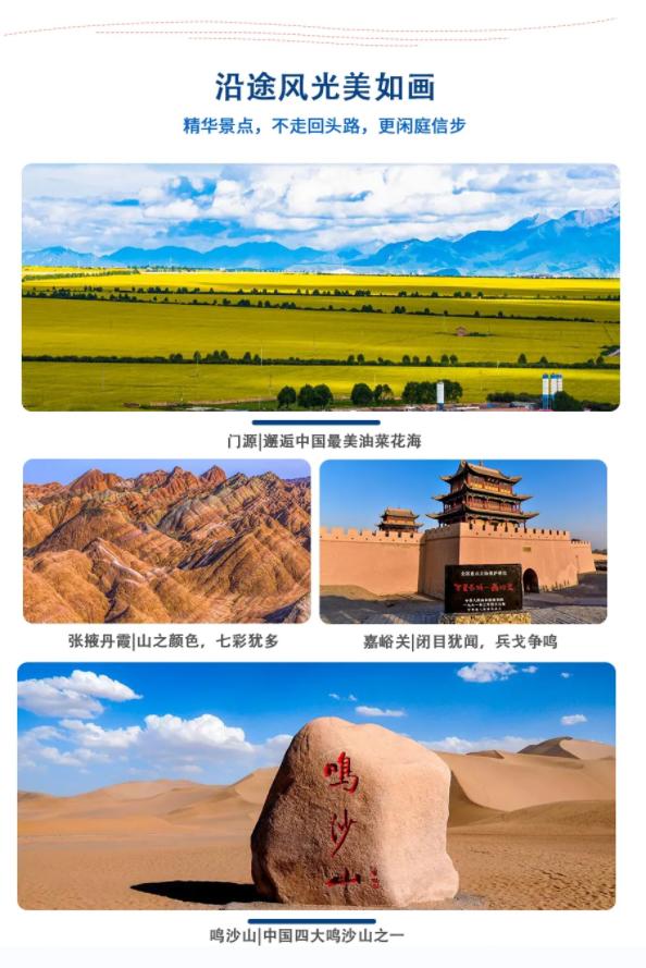 上午抵達瓜州,參觀大地之子等衆多網紅打卡點,下午前往嘉峪關遊覽萬里長城天下第一雄關【嘉峪關城樓】及【長城博物館】。