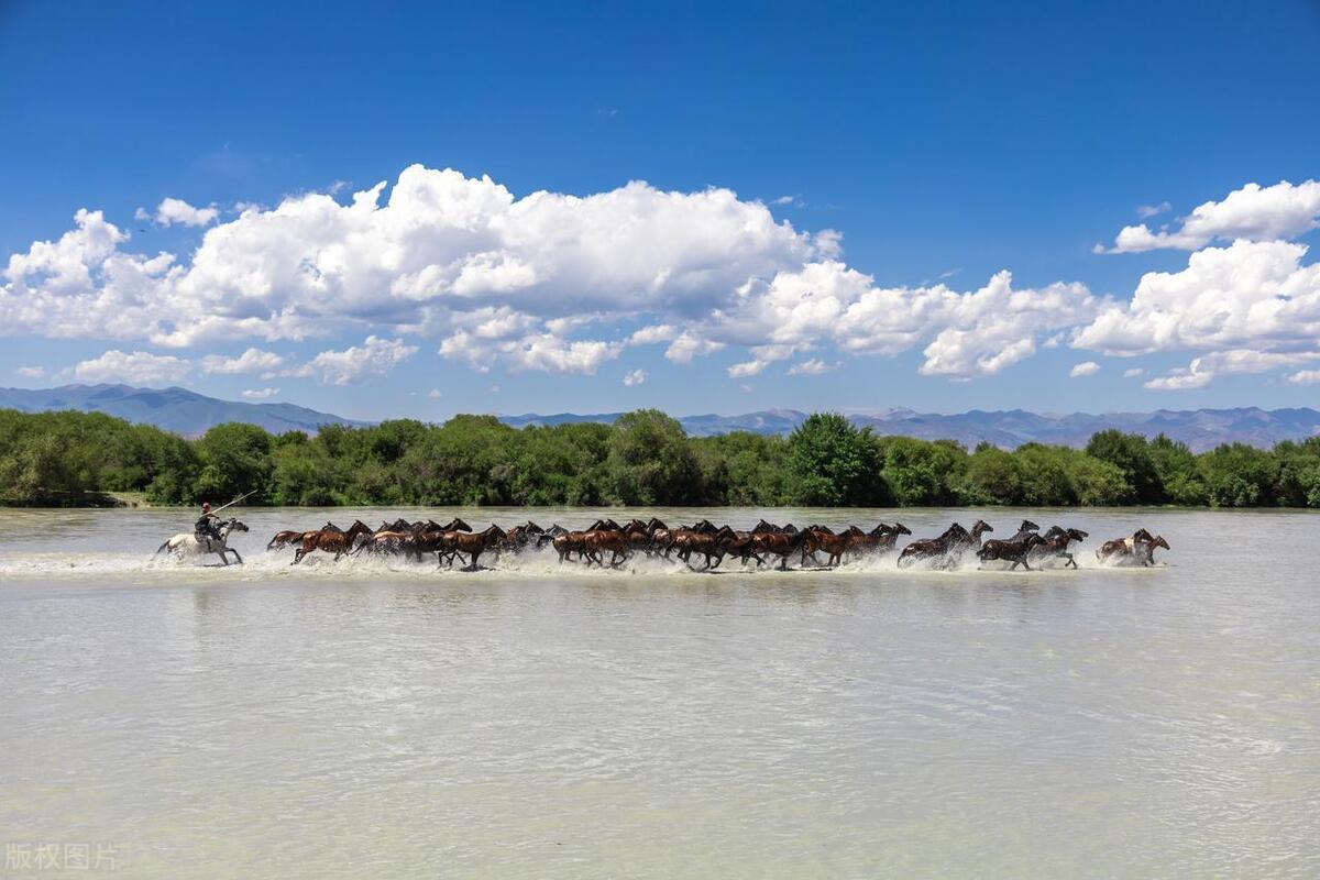 今年的網紅景點,“中國天馬之鄉”昭蘇的旅遊名片,幾十匹駿馬在河中奔跑的短視頻風靡全國,門票60元區,間車20元,但很多並非現在所拍,因爲目前昭蘇溼地公園那條河混濁如白漿,一點不清澈,而且河水深到馬腿跟了,馬根本跑不起來,觀者看着都很難受,所以不去也罷。