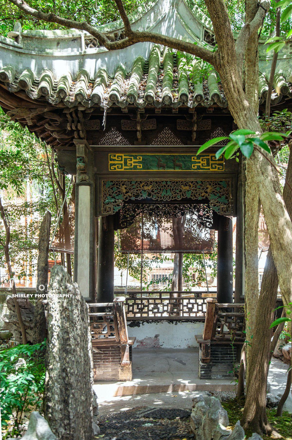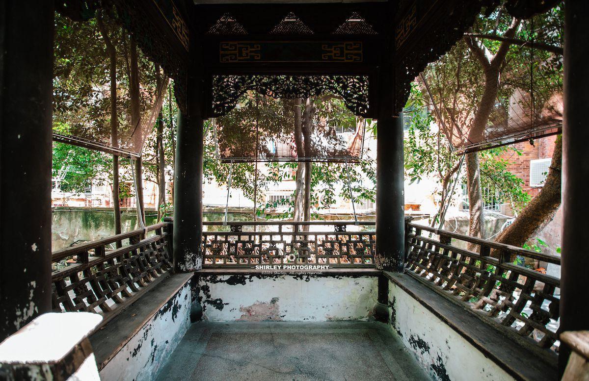 園林裏體量最大的建築就是假山上的一座木構四方涼亭,已是斑駁不堪,畫檐蛛網,但是仔細觀察還是能輕易看出當時的氣派與講究。涼亭漆色仍在,鏤空雕花繁多,古樸質感十足。偶爾有附近的居民過來亭子裏休息,除此之外就是流浪貓的天下了。