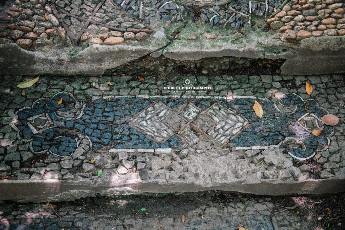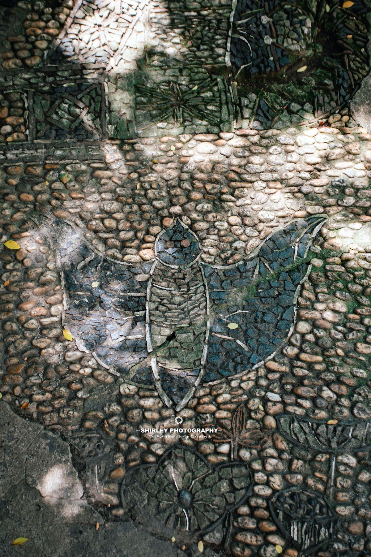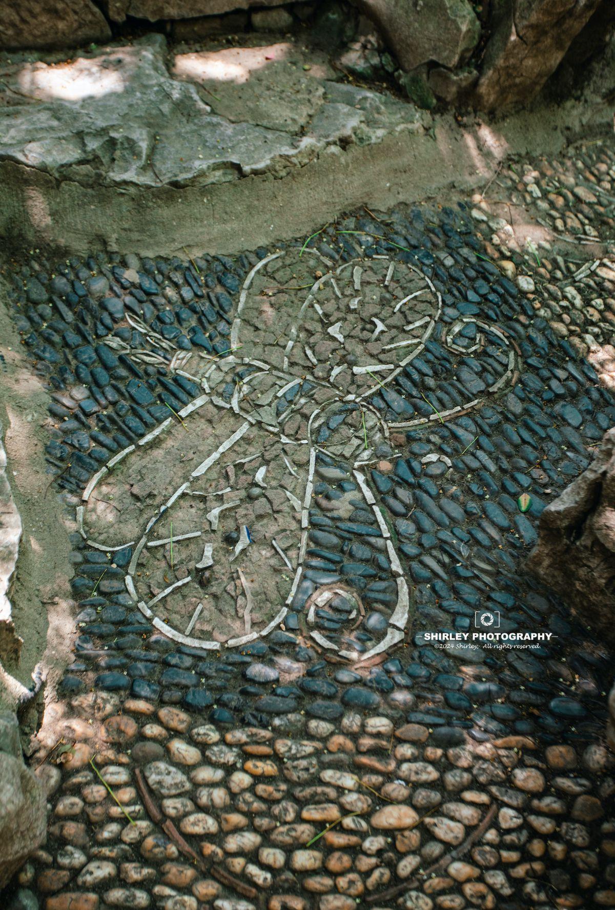 通往亭子的石徑上,鵝卵石鋪成了蝙蝠、蝴蝶、鳳凰等圖案,如今依舊栩栩如生。