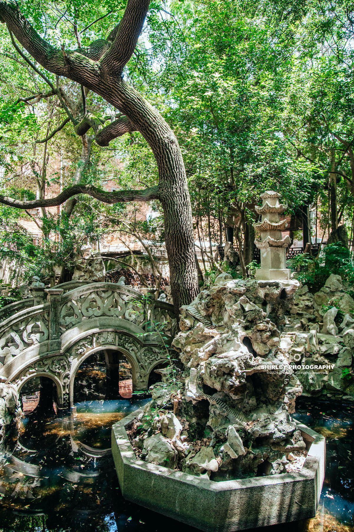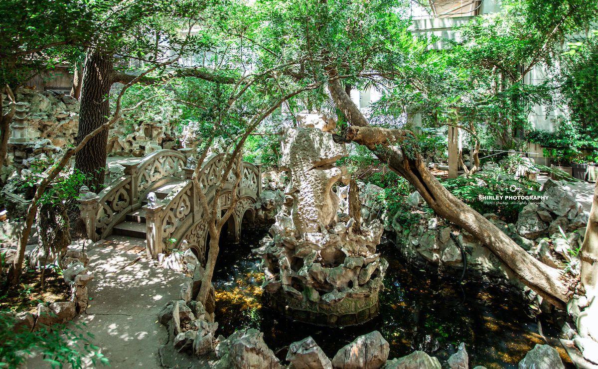 花園很小,幾乎可以用迷你來形容。但是江南園林一步一景的精髓,這裏完全傳承了下來,十分驚豔。園林的主體是一片曲折有致的池塘,上面石橋飛架,若干假山點綴其間。石橋延伸弧度優美,欄板上有精緻的鏤空雕刻,是整個空間裏的點睛之筆。雖然石階已有缺損,但橋柱上的小獅子雕塑仍然保留着,造型傳神,實屬難得。
