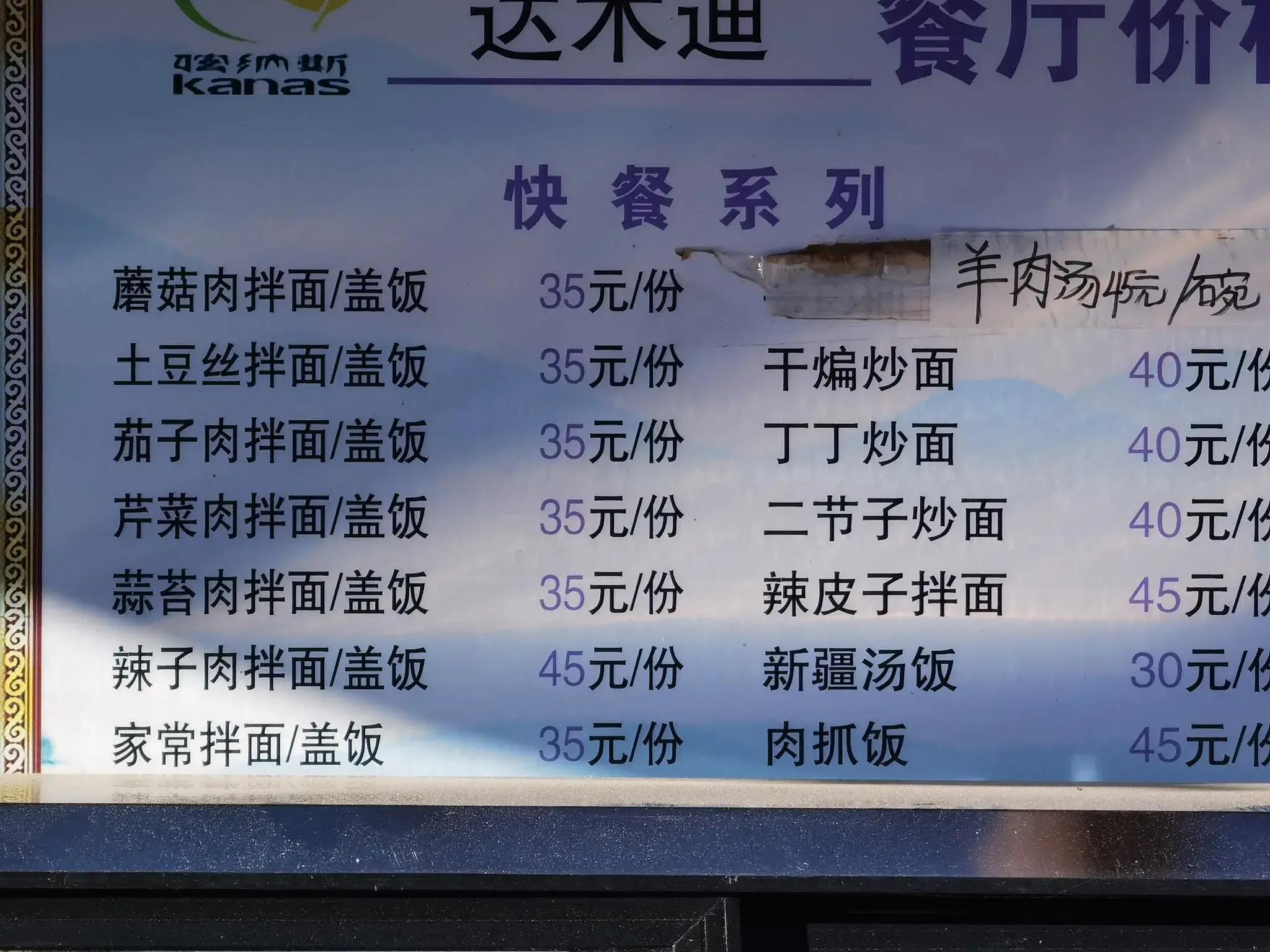 新疆美食沒特色,而且喫的太貴了。新疆“有菜無系”,以牛羊肉爲主,口味偏重,烤肉、抓飯、大盤雞、饢、烤包子等,,從清晨的第一碗羊肉湯再到夜晚的最後一頓烤肉,只能是嚐鮮的對象,偶爾喫一次很驚豔,天天喫誰也受不了。而且價格巨貴,在喀納斯和禾木,一個牛羊肉菜價都是180元上下,隨便一個炒菜都是80元左右,一個拌麪都得30~40元。