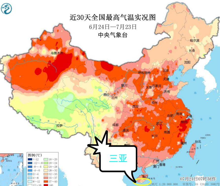 從中央氣象臺昨天製作的近一個月全國高溫分佈圖,可以明顯看出入夏以來全國各地的高溫情況,顏色越紅的溫度越高,顏色越綠的溫度越低,溫度最高的是華中、華北和新疆等地,中國南方屬於華南相對涼爽,尤其是人們認爲應該最熱的三亞,看溫度顏色,明顯比內地很多城市涼快多了。