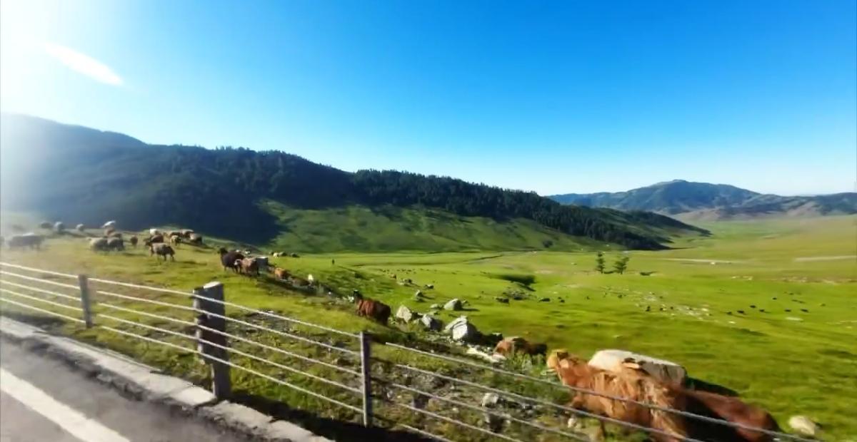 去喀納斯的路上,不要忘了路兩邊的風景。清晨的陽光溫柔地揮灑在草原上,道路兩邊是綠草鮮花,藍天白雲,滿山的牛羊,路上的風光一點不亞於伊犁河谷。