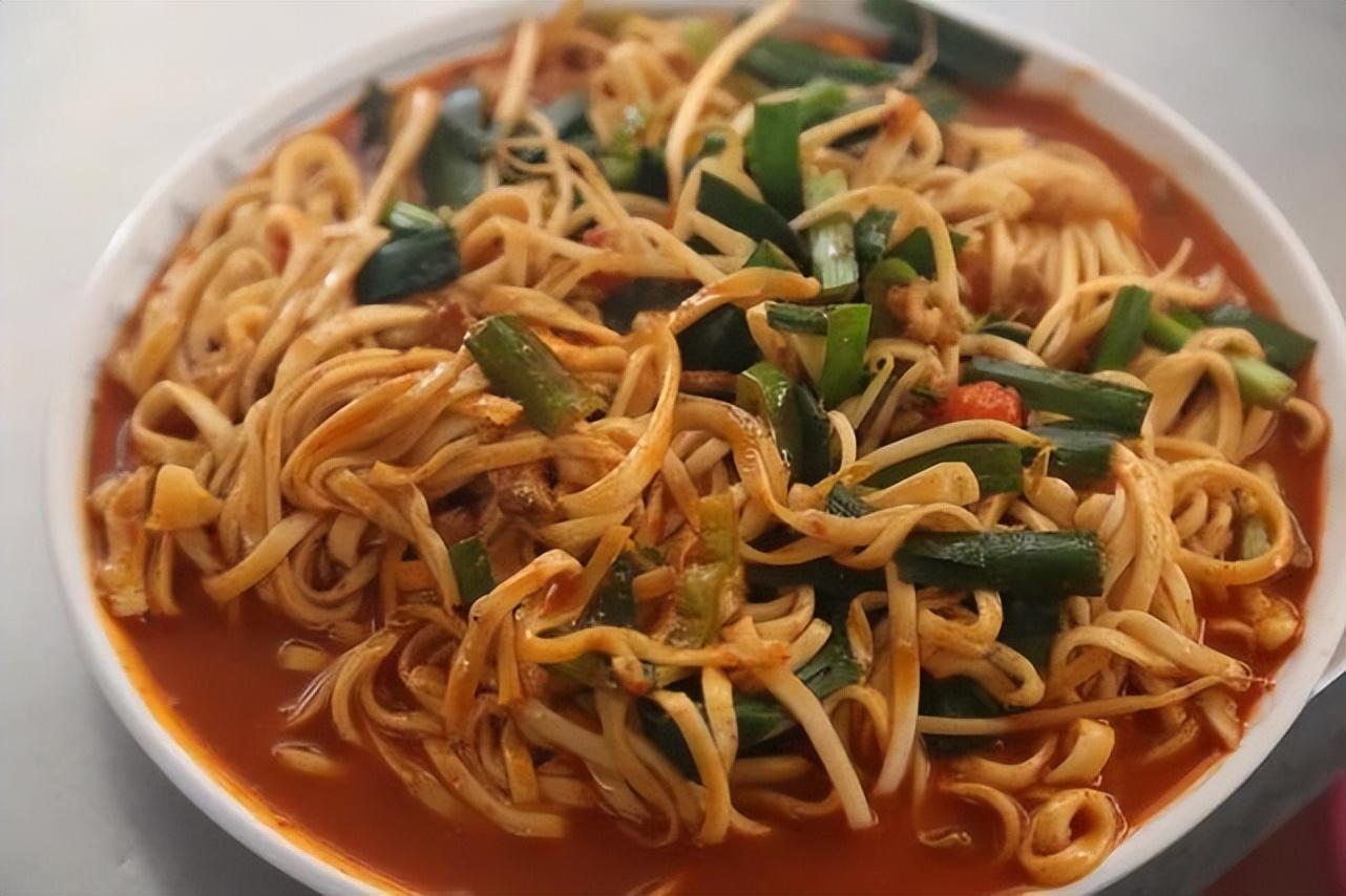 炒拉條,是極富當地特色的一道美食,放入適度韭菜、辣椒麪和山西陳醋,湯汁濃稠,顏色紅豔,香氣四溢,酸辣可口,有“不喫炒拉條,等於白來中衛”的說法。中衛商城,被當地人稱爲“炒拉條一條街”。