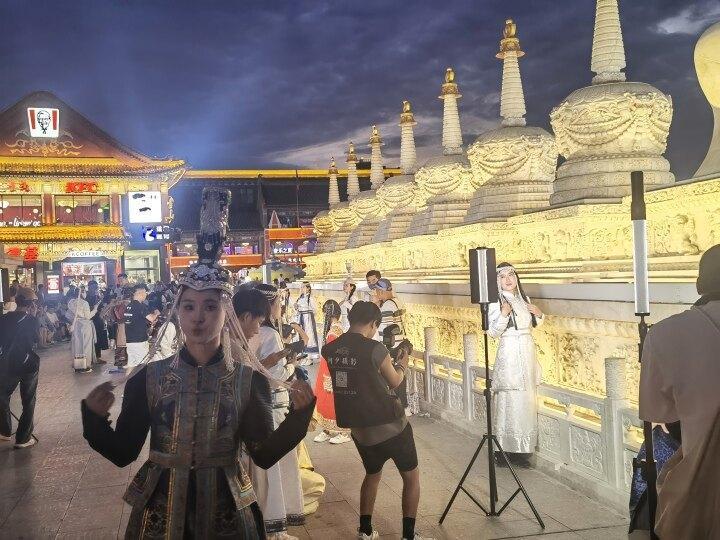 “賽拜努(蒙古語,意爲‘你好’)!”隨着夜色漸濃,老街旅拍熱鬧起來,隨處可見頭戴罟罟冠、圓頂立檐帽,身着各色蒙古袍的遊客,大家一面學着蒙古語,一面盡力地“凹造型”。中國旅遊報社記者邊走邊數,轉角樓、羊咩咩、雲朵……老街及周邊的旅拍店真是不少。