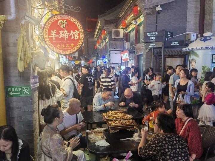 晚上8時,青城呼和浩特的夕陽漸漸落下,塞上老街燈火璀璨,“冰煮羊肉嘞”“爛糊的燒羊蹄”……高亢的吆喝聲混着“滋啦滋啦”的燒烤聲和悠揚遼遠的草原音樂,迴盪在有着400餘年歷史的古建間,吸引着市民遊客循聲而至。
