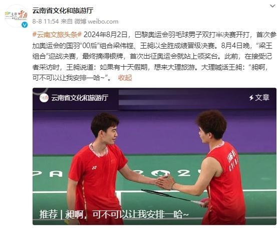 近日,在巴黎奧運會羽毛球男子雙打決賽中成功摘銀的運動員王昶在採訪中曾表示,如果有10天假期的話自己會去旅遊。
