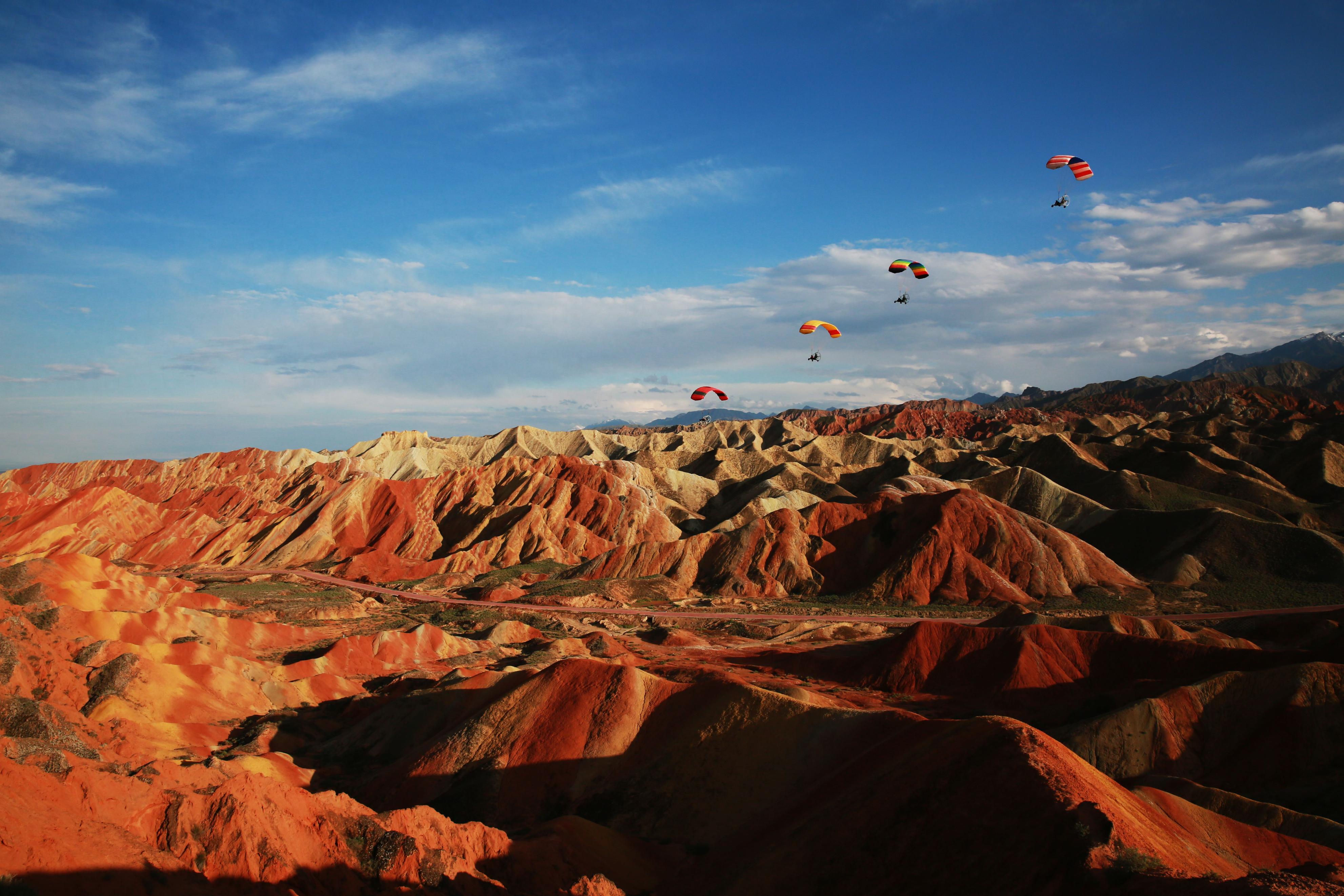 在日前舉辦的第四屆張掖七彩丹霞熱氣球嘉年華上,熱氣球和丹霞的結合給遊客帶來了一場視覺盛宴。精彩的滑翔傘特技飛行表演中,飛行員們駕駛着滑翔傘,在藍天白雲與彩色丘陵間自由翱翔,時而俯衝,時而盤旋,贏得遊客陣陣歡呼。
