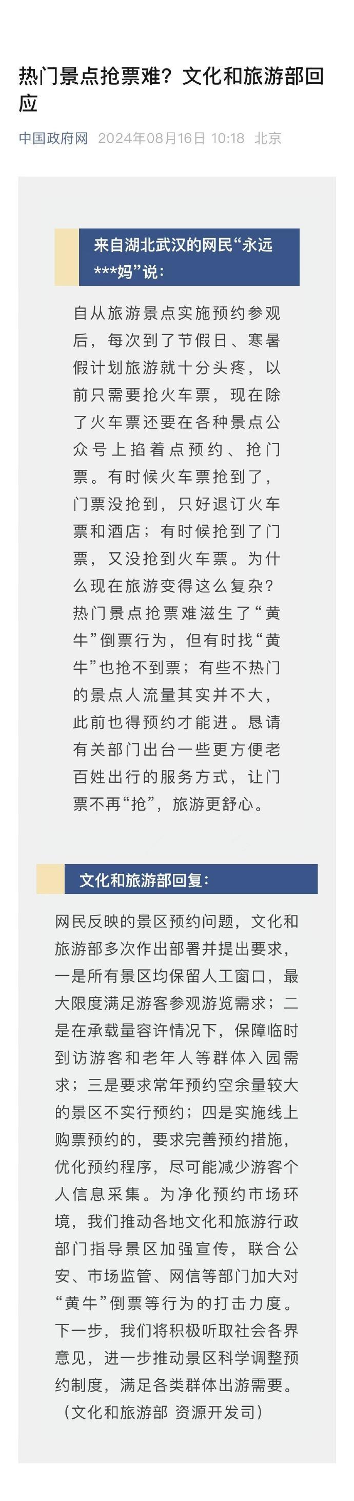 網民反映的景區預約問題,文化和旅遊部多次作出部署並提出要求,一是所有景區均保留人工窗口,最大限度滿足遊客參觀遊覽需求;二是在承載量容許情況下,保障臨時到訪遊客和老年人等羣體入園需求;三是要求常年預約空餘量較大的景區不實行預約;四是實施線上購票預約的,要求完善預約措施,優化預約程序,儘可能減少遊客個人信息採集。爲淨化預約市場環境,我們推動各地文化和旅遊行政部門指導景區加強宣傳,聯合公安、市場監管、網信等部門加大對“黃牛”倒票等行爲的打擊力度。下一步,我們將積極聽取社會各界意見,進一步推動景區科學調整預約制度,滿足各類羣體出遊需要。