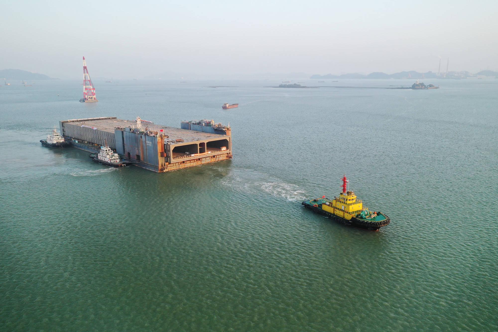 沉管技術。深中通道採用了雙向八車道,也意味着使用的沉管比港珠澳的六車道用的沉管更沉更大,施工難度是世界級的,施工團隊爲此專門設計製造了一艘沉管運輸、安裝一體的施工船,甲板比足球場還大,船上配備了大型升降機,實現了每節高達6萬多噸的沉管運輸、沉底、安裝一氣呵成。