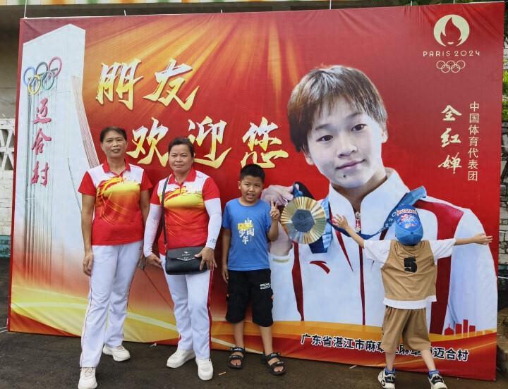 隨之,全紅嬋的家鄉廣東省湛江市麻章區邁合村又一次“火”了!村子入口處,一座白色村牌矗立,奧運會五環造型鑲在頂部,一旁有全紅嬋奪冠海報,全紅嬋爺爺家門口,寫着“朋友,邁合村歡迎您!”字樣的立牌格外醒目,紛至沓來的遊客開心地與之合照打卡。