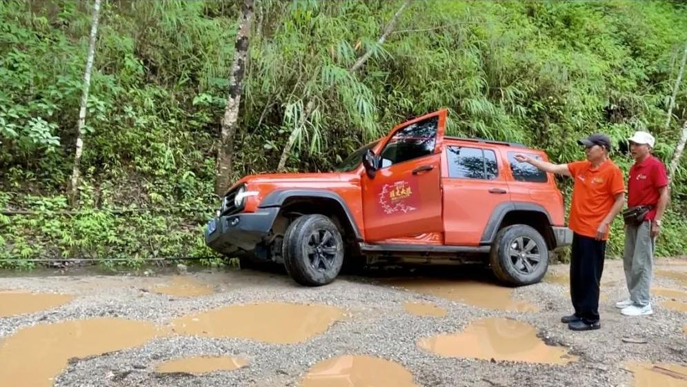 我們是第一次遇到這種情況,剛一看到還挺着急的。只聽到方司令在對講機裏用輕鬆的語氣說道:"哦~,看到了,看到了。不要急,我們來了。"張隊把車調頭過來,從車的前面拉出鉸盤拖繩,牛牛和方司令幫忙掛在隊友車的拖車鉤上,張隊一邊指揮一邊操作,大家幫忙在後面推着,齊心協力把車拉了出來。
