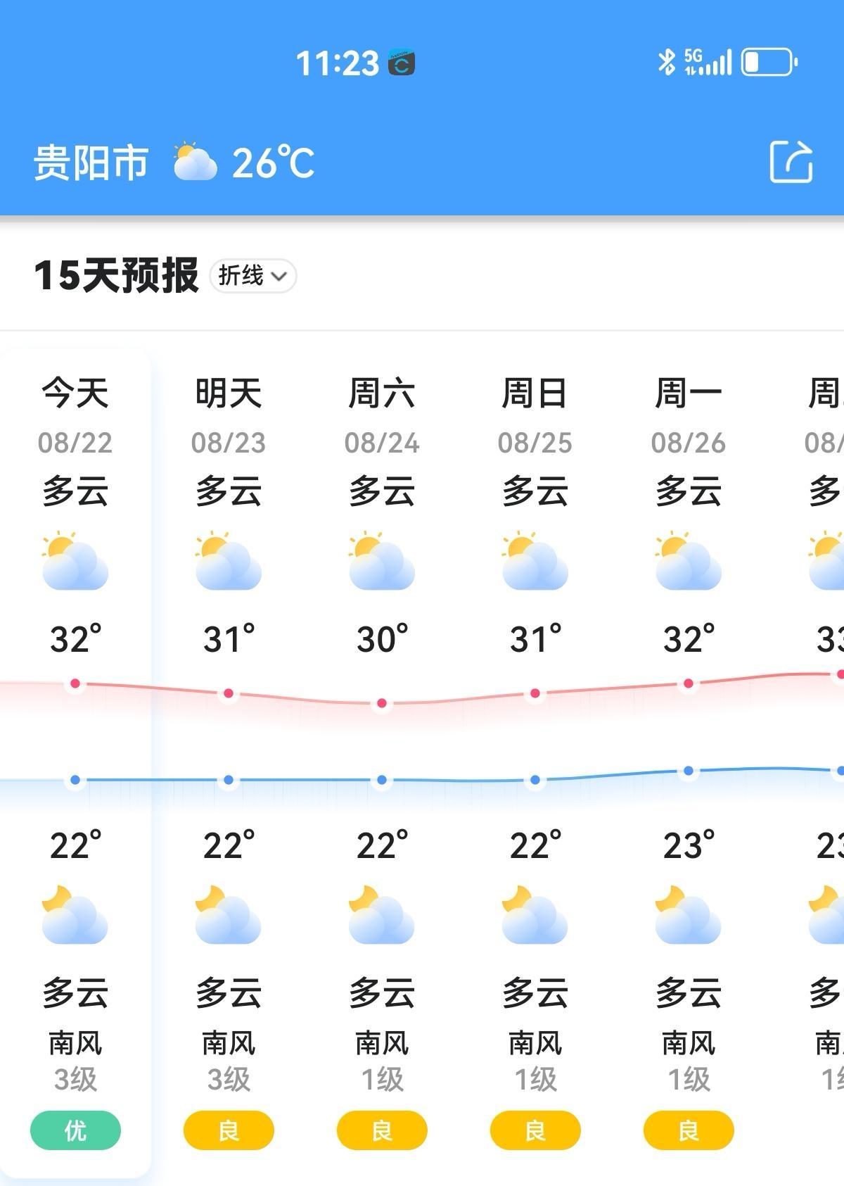 8、貴陽真的適合避暑嗎?爽爽的貴陽也叫了很多年了,沒去過的人覺得夏天的貴陽很涼爽,溫度不會上到30度,其實這是過分宣傳的結果,畢竟貴陽的海拔只有1100米,低於前面說的1200米的最低線,所以只能說不熱,還談不上多涼爽,看這兩天的貴陽天氣,這是最真實的,每天溫度雖然都過了30度,但低溫只有22度,體感還是很舒服,畢竟和周圍大城市比,貴陽簡直是夏天的天堂,而且作爲省會城市,可居可玩,酒店賓館200-300元的很普遍,性價比挺高,是避暑兼度假的首選。