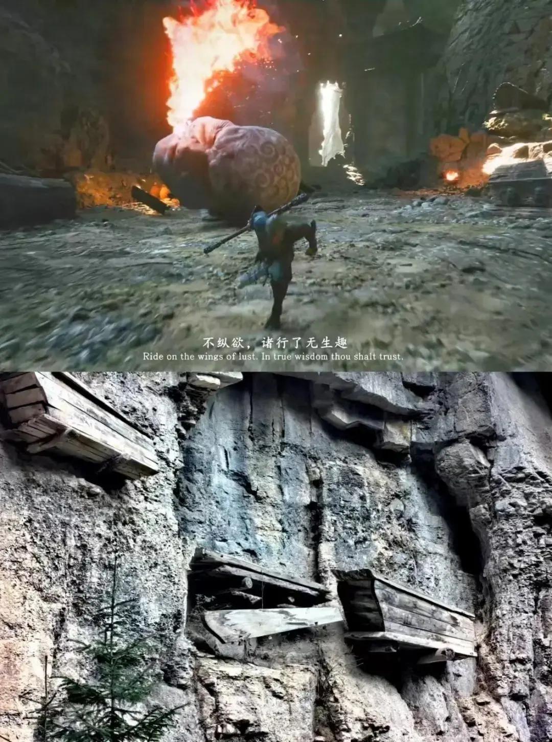 上爲遊戲場景,下爲寧武石門懸棺。