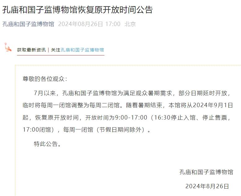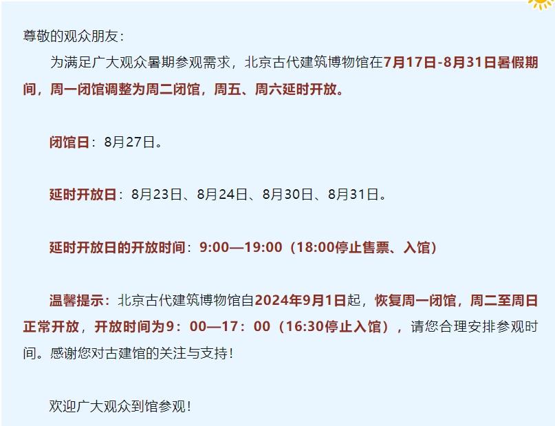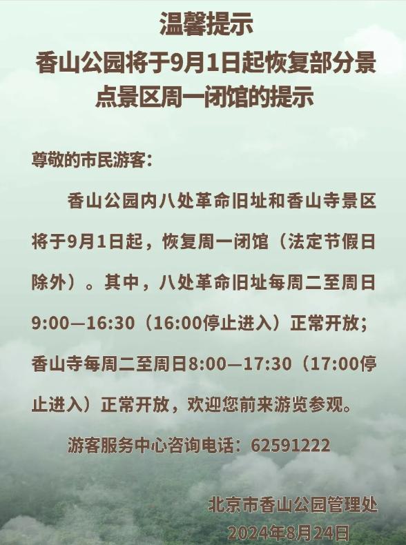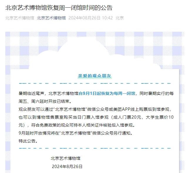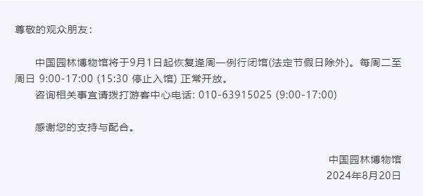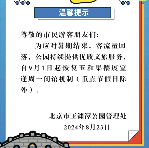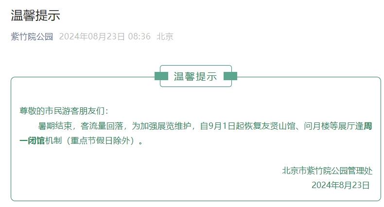 據不完全統計,北京藝術博物館、北京市玉淵潭公園、香山公園、中國園林博物館紫竹院公園、孔廟和國子監博物館、北京古代建築博物館等多家場館、景區官宣自9月1日起,恢復每週一閉園(館),同時暑期實行的每週五、週六延時開放活動也隨之結束。