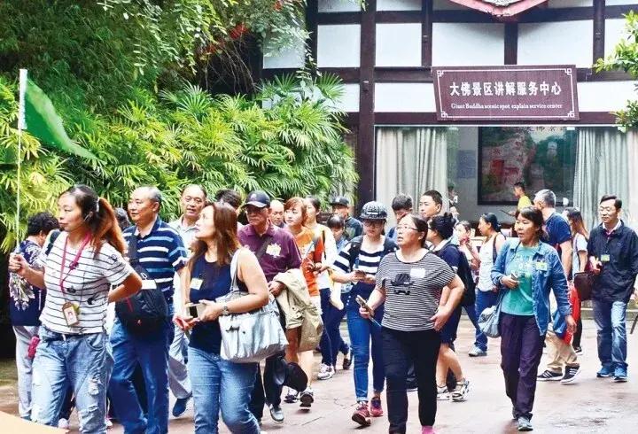 導遊帶團在四川樂山大佛景區遊覽|記者 陳晨 攝
