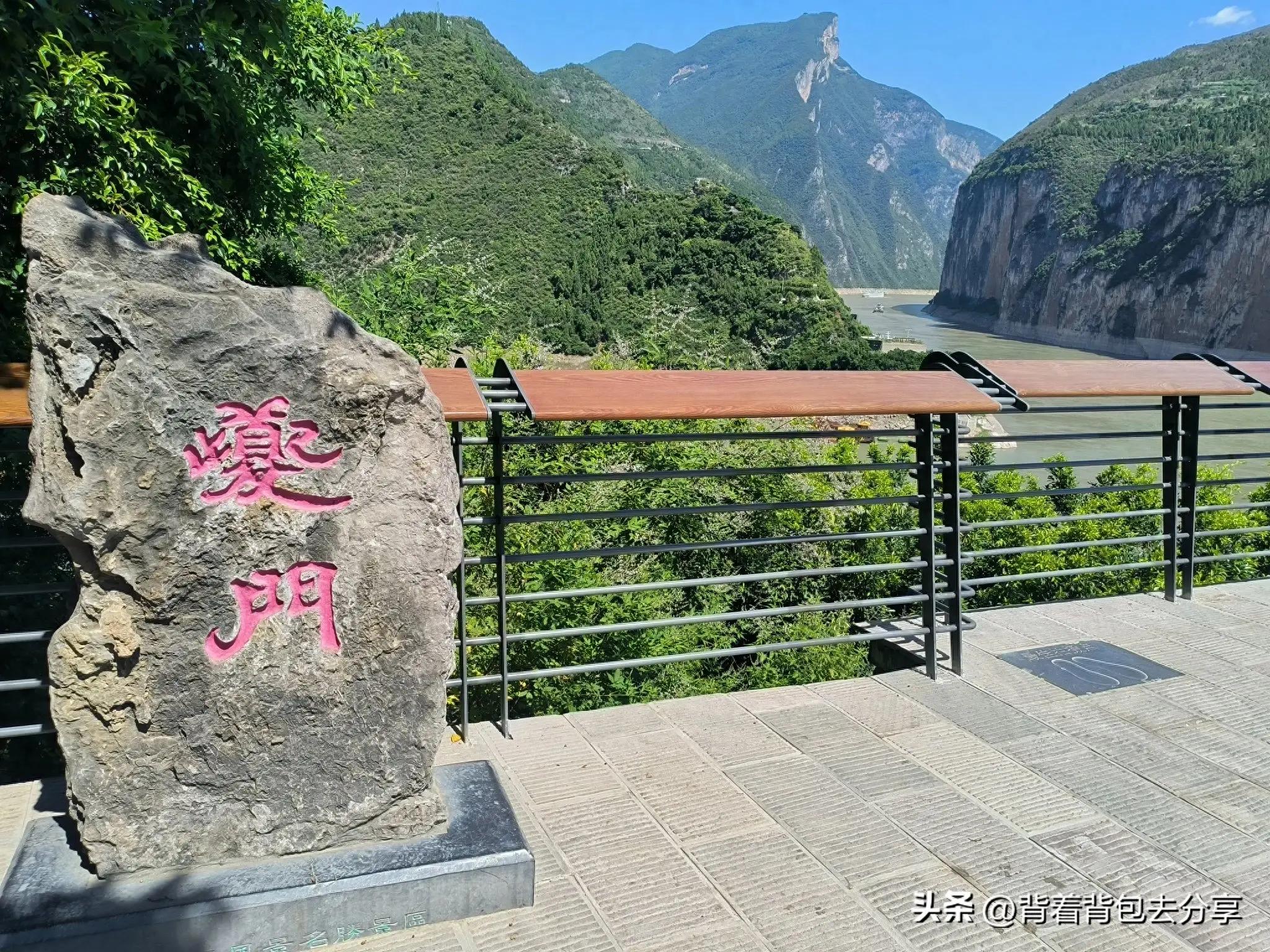 之後看過赤甲樓,原路返回至渡口,乘船至白帝城,由於長江水位上升,現已成爲一座孤島,途徑去往白帝城,這邊有處絕佳的觀景平臺,是觀賞夔門的最佳位置,在觀景臺的左側立有石碑,上刻有夔門二字,在這裏也給拍照的遊客,借取了一張十圓,藉此場景,爲兒子拍照打卡