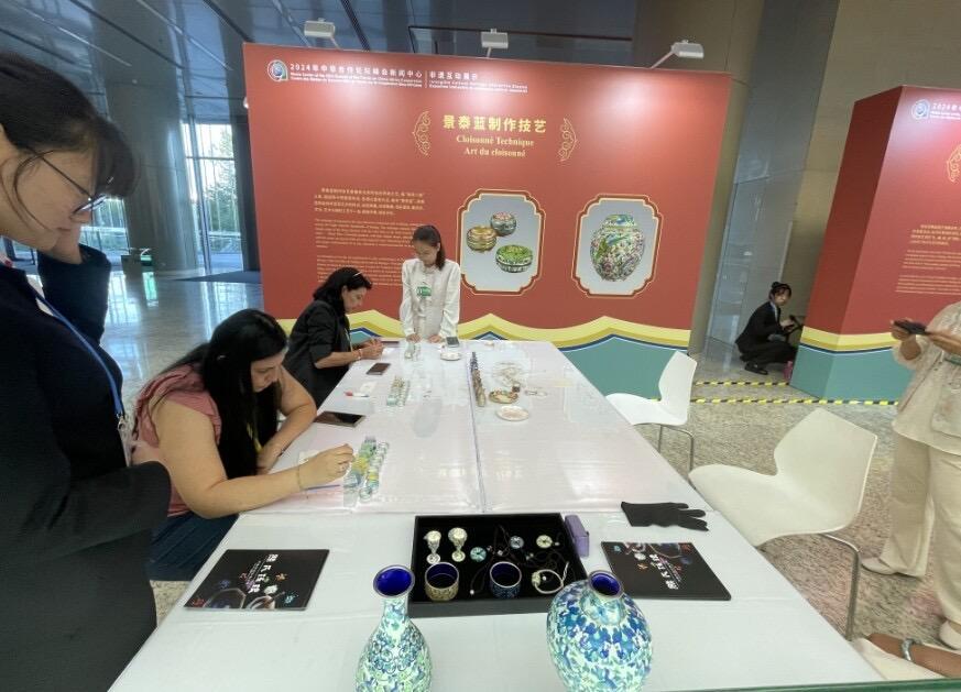 在景泰藍製作技藝體驗區,四季平安瓶、鸚鵡紋罐、吉祥孔雀瓶、平安扣、桶珠等一一亮相,色彩絢麗、花紋精細,引得外國友人駐足細細端詳。不少人驚歎之餘,忍不住動手一試。