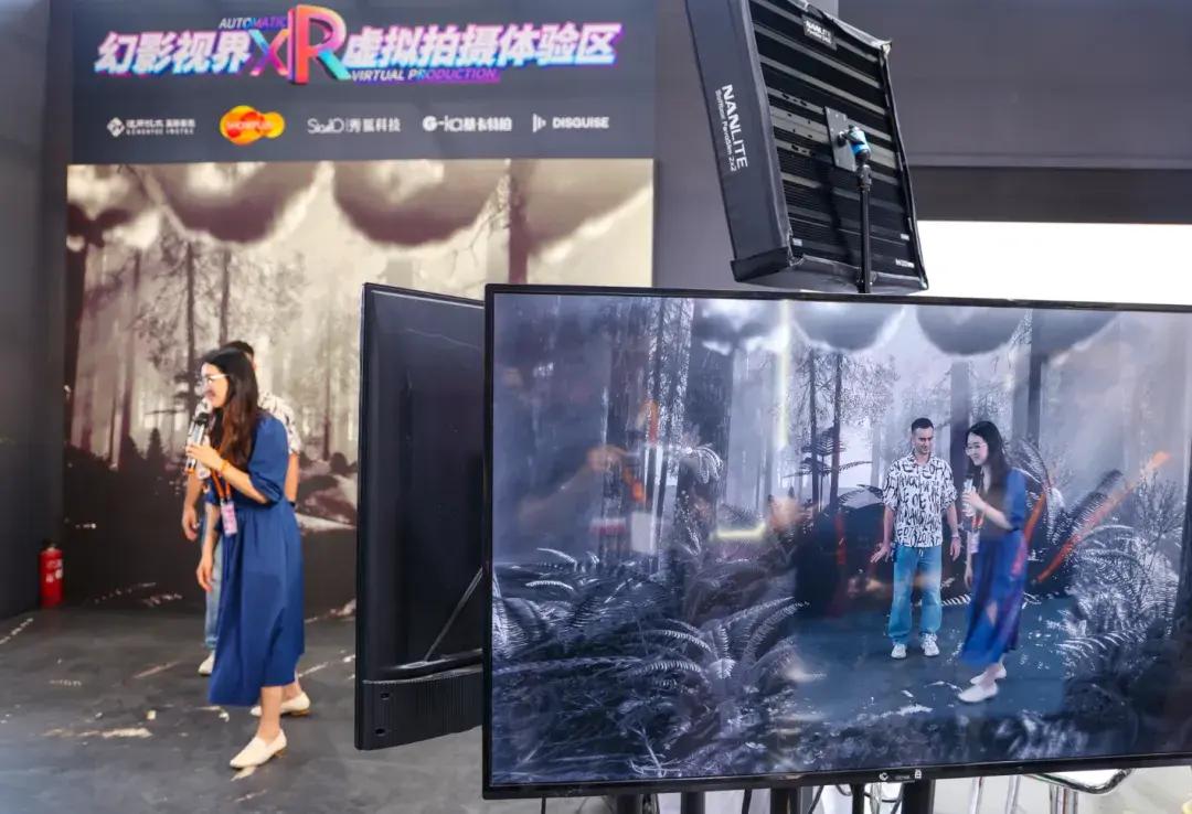 中國電影博物館展區內,外國遊客在體驗XR虛擬拍攝。