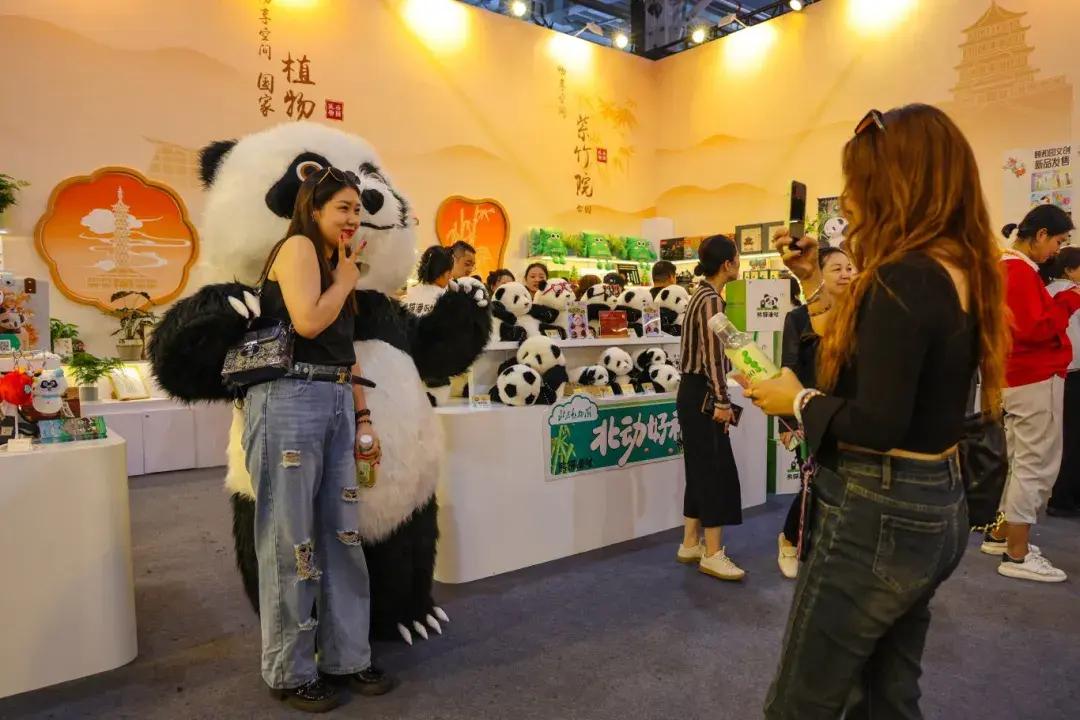 遊客在北京動物園文創展區與熊貓玩偶合影。