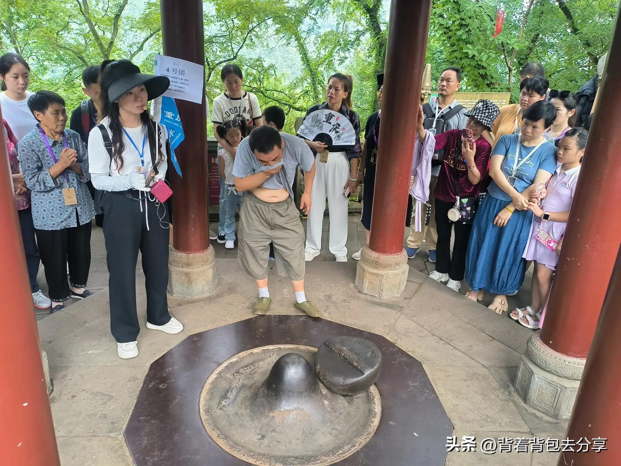 出寥陽殿,右手是星辰礅,也是遊玩鬼城不可錯過的景觀之一,星辰礅由上下兩部分組成,上面的鐵墩叫心神鐵,是個半球形,重182.5千克,下面底座叫鐵靈根,這裏,有位網紅師傅在此表演的石來運轉,將三百多斤重的鐵石,放置鐵靈根之上,看過師傅的表演,便來到了唯善呈和碑,此碑是四川省原書協主席著名書法家,李半黎先生在1987年遊覽名山後所寫