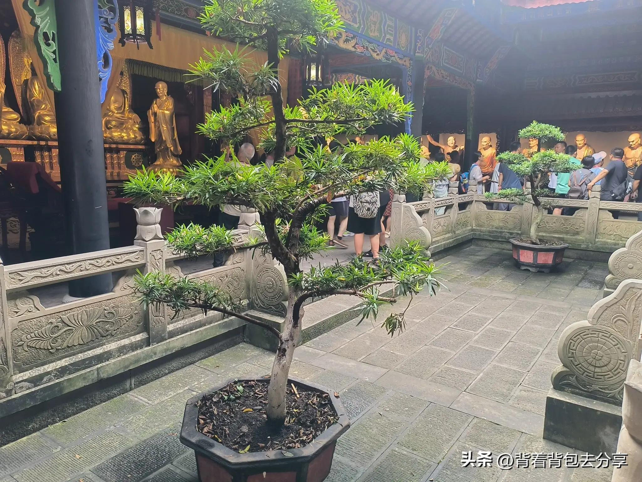 走走奈何橋,兒子一人獨走而過,下邊有攝影師爲遊客拍照,每過一名遊客,攝影師都會爲其拍照,留下最美的瞬間,過了奈何橋,便是寥陽殿,始建於明朝永樂年間,是朱元璋的兒子蜀獻王朱椿的香火殿,前殿塑彌勒佛,後殿供奉的是三世佛-觀音等,兩側塑形象各異的十八羅漢,對面塑護法韋陀