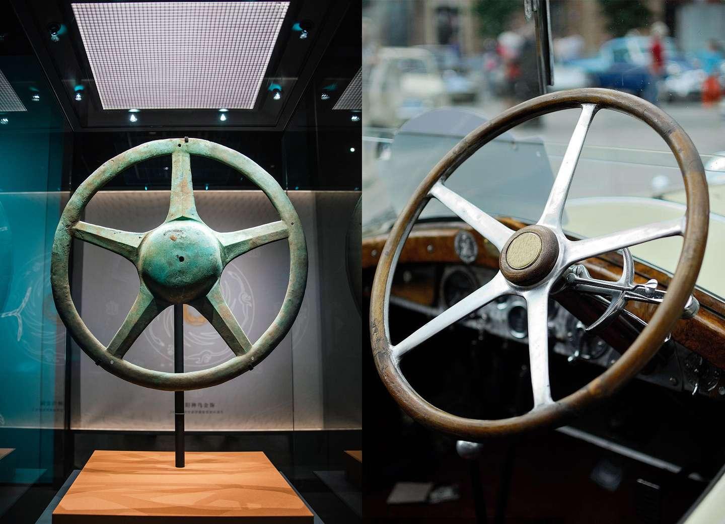 三星堆絕對是穿越即視感文物的集中地,比如這個青銅太陽輪,像不像以前汽車的方向盤?這種形制的器物從未見於以往出土的文物,其實既不是車的方向盤,也不是車輪。目前主流的觀點認爲,這是古蜀人對太陽崇拜的實物化,因此稱之爲三星堆青銅太陽輪形器。