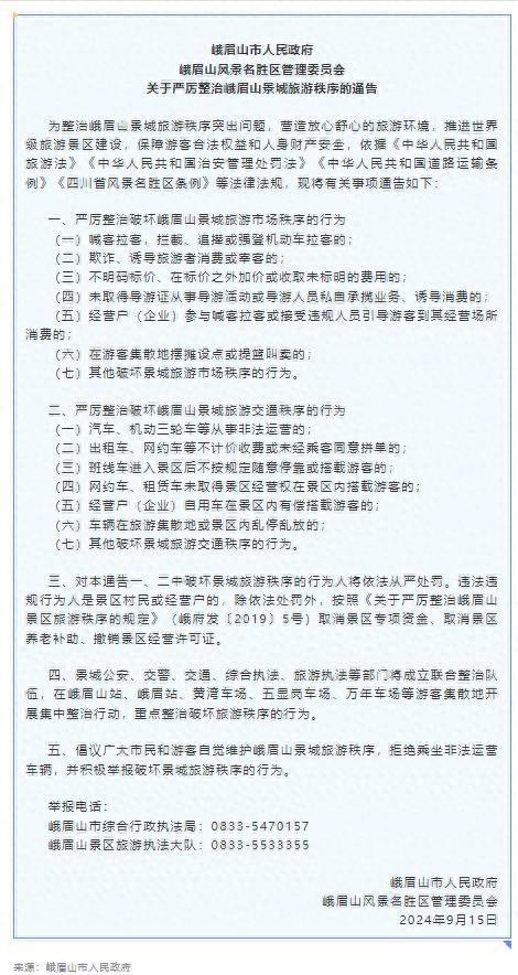 據報道,近日,有遊客投訴峨眉山擺渡車設計不合理,催生了“黑車”產業鏈,出現“宰客”現象,“5公里左右,開口就要100塊錢!”對此,峨眉山市人民政府、峨眉山風景名勝區管理委員會及時發佈通告回應:嚴厲整治峨眉山景城旅遊秩序,整治內容包括破壞峨眉山景城旅遊市場秩序的行爲和破壞峨眉山景城旅遊交通秩序的行爲。